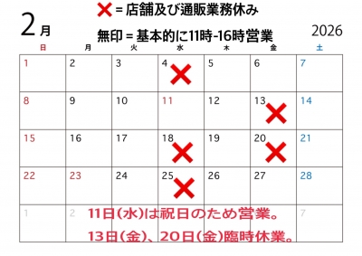 Owner's Blog 2月の営業日程 2026年01月30日 2月も基本的に11時〜16時営業(閉店時間が早めですので、15時くらいまでのご来店にご協力をお願いします)。 毎週水曜定休日ですが、11日(水)は祝日のため営業します。その週の金曜日が代休で臨時休業。 翌週の20日(金)も都合により臨時休業となります。 変更・追加があった場合こちらのブログ、インスタグラムなどのSNSを更新しますので、最新の情報をご確認ください。 よろしくお願いいたします! Jack's Mart