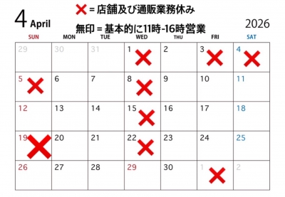 4月も基本的に11時〜16時営業(閉店時間が早めですので、15時くらいまでのご来店にご協力をお願いします)。