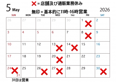 毎週水曜定休日+3日(金)、4日(土)、5日(日)の3日間はイベント出店のため臨時休業。