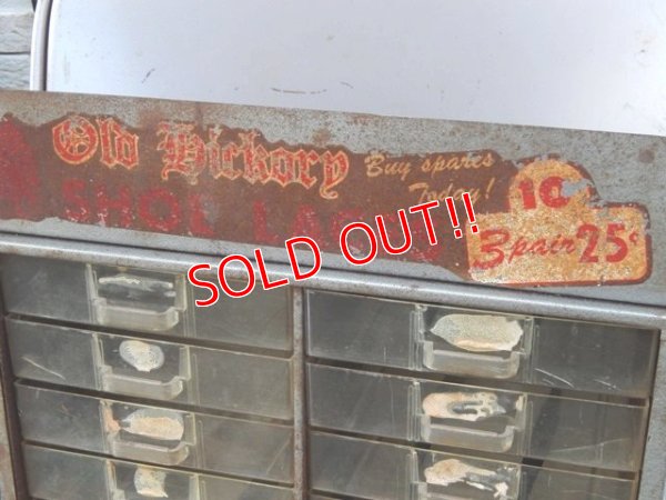 2列16個の引き出しが付いているミニキャビネットは元々靴紐が入っていたものです。