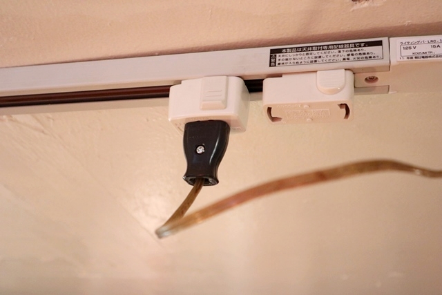 プラグは一般的なコンセントタイプで、吊り下げるだけだとコードと一緒にある鎖は下がってきてしまう状態ですので、S字フックなどで調整する必要があります