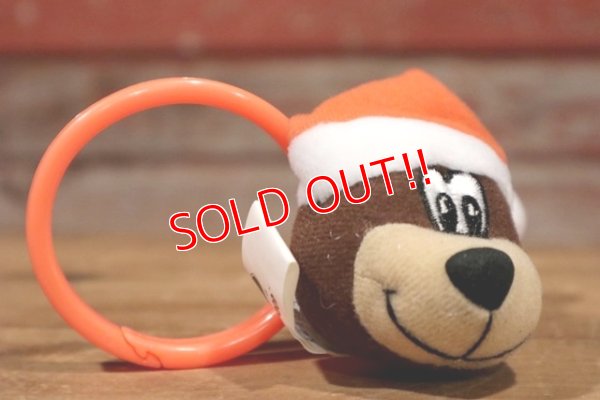 ぬいぐるみの顔にプラスチック製のリングが付いています