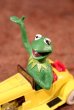 黄色いクラシックカーに右手を挙げたカーミットが乗っています☆