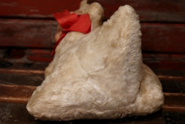 生地に黄ばみ、ラバーに薄汚れ、首のリボンに小さな穴などありますが、大きな破れなどのダメージはありません