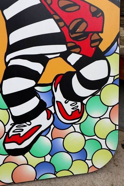 両手を広げたハンバーグラーが大きくプリントされており、背面にはカラフルなボールがたくさんあります