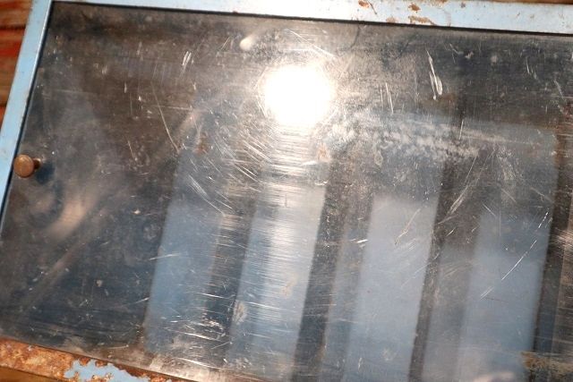 くすんだブルーのメタルにスライド式の扉は薄いアクリル製