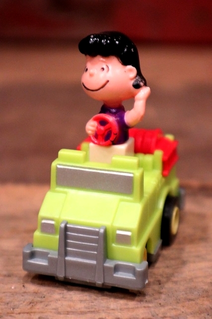 スヌーピー、チャーリーブラウン、ルーシー、ウッドストックがそれぞれ乗り物に乗っています☆