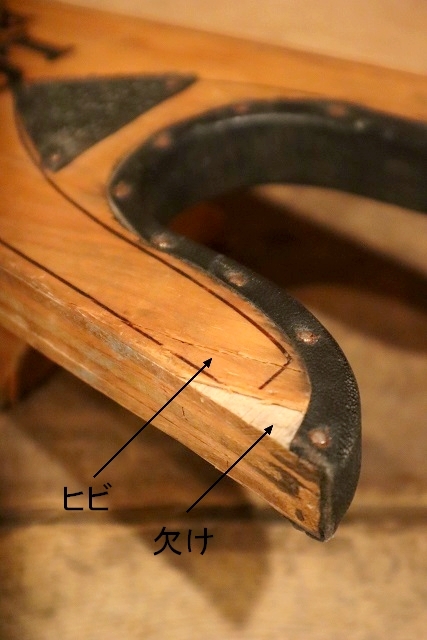 一部木に欠け(6枚目画像参照)、角の黒い合皮部分に小さな破れのダメージ