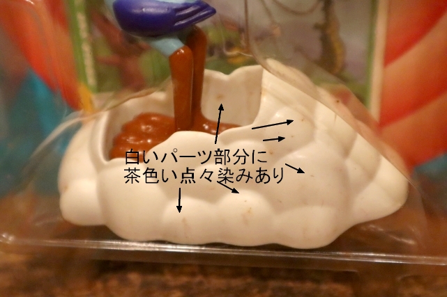 ご覧の様に未開封ですが、内部足元の白いパーツや尾の部分に茶色い斑点状の染み汚れが発生しています