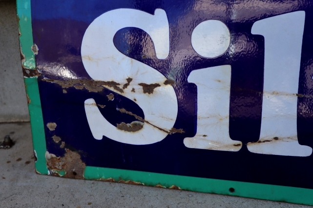 琺瑯特有の穴、塗装剥げ、多少の歪みなどありますが、非常に重厚な看板です