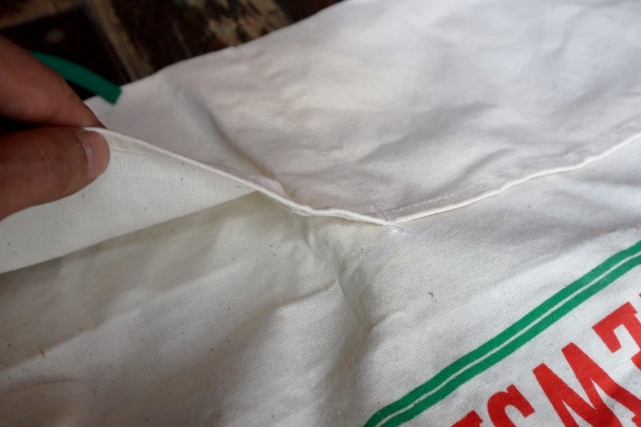 薄めのコットンキャンバス地で、多少のシワ、薄汚れ、ポケット中央付近に茶色い汚れ(4枚目画像)、右下に少し黄ばみ(5枚目画像)があります