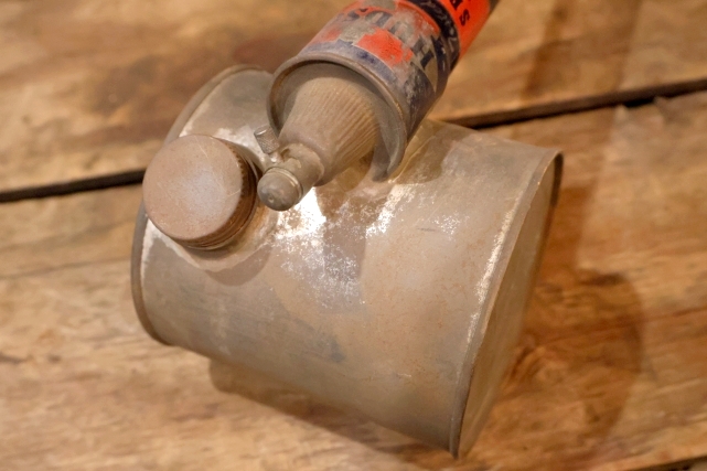 缶容器に液体が入り、取っ手をピストンすることで筒の先から噴霧される仕組みです