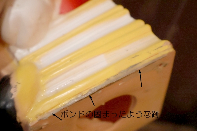 底面にヒビと小さな穴、角にボンドの固まったような物が付着しています