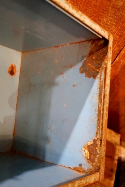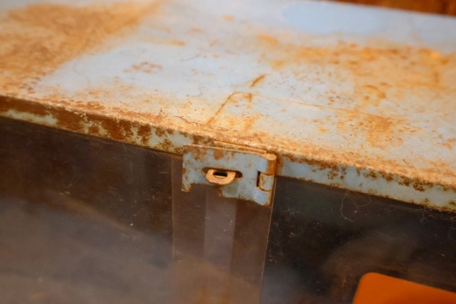 くすんだブルーのメタルにスライド式の扉はかなり薄いアクリル製