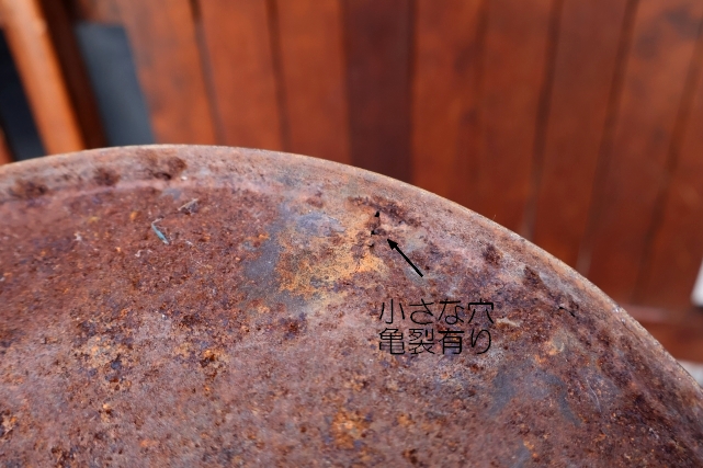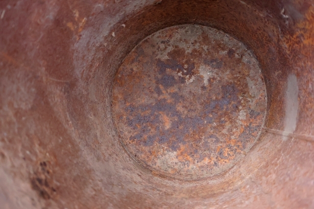 全体的に小傷、汚れ、錆び、着色、凹み、内部と底部はかなり錆に覆われているため、屋内での使用はあまりおすすめしません