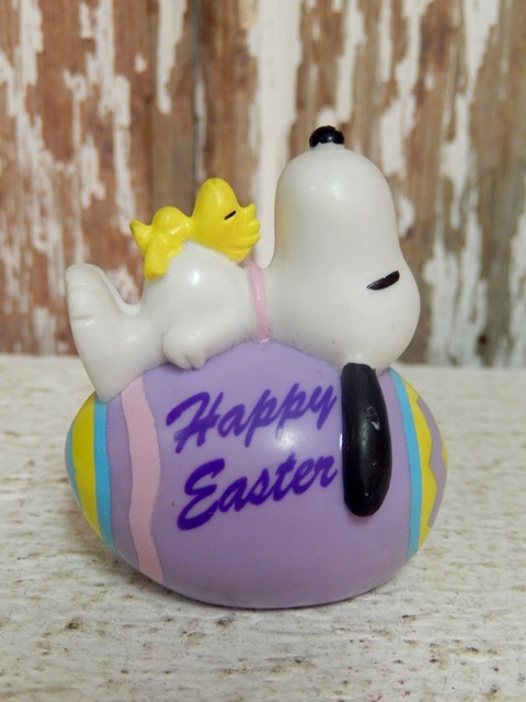 紫色のイースターエッグにスヌーピーとウッドストックが寝ています☆