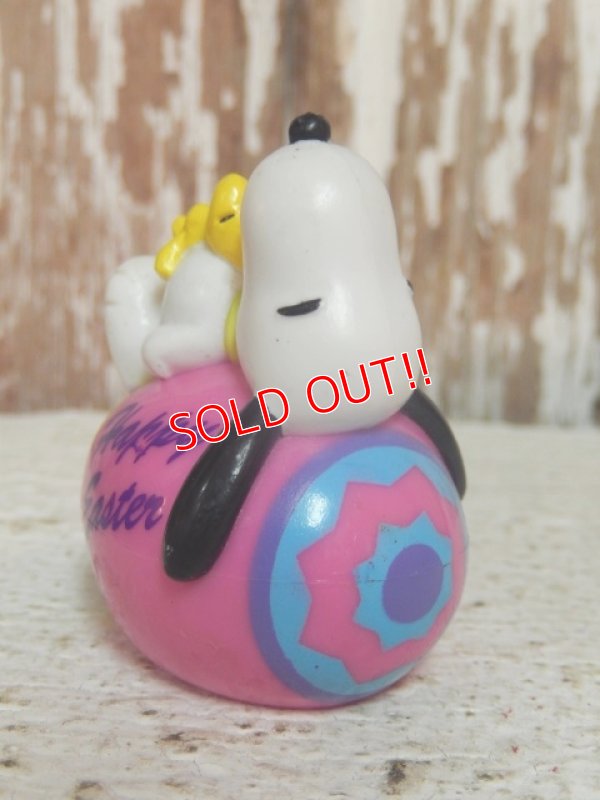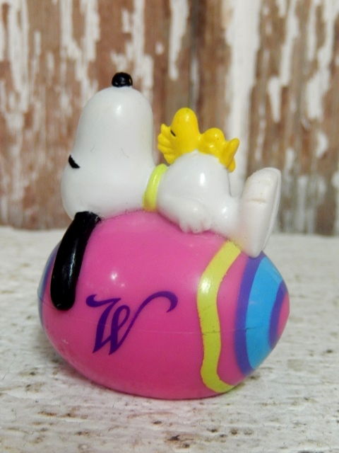 ピンク色のイースターエッグにスヌーピーとウッドストックが寝ています☆