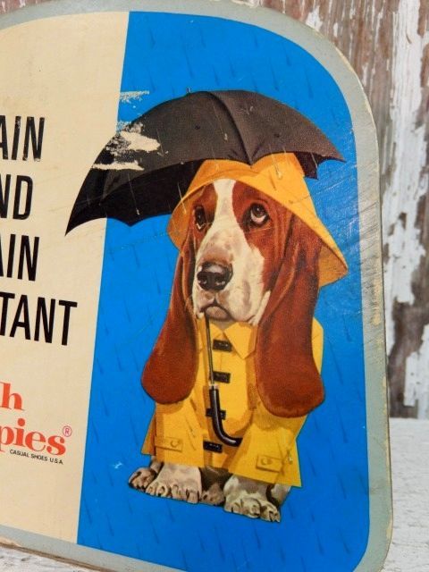ct-141001-22 Hush Puppies / 70's Cardboard sign "Rain and Stain Resistant"